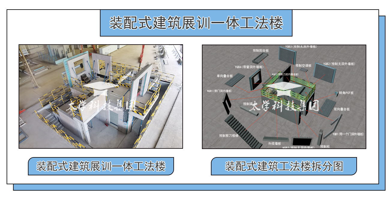 装配式建筑展训一体工法楼包含有窗和无窗预制外墙板、有门和无门预制内墙板、单向和双向预制叠合板、预制叠合阳台板、预制叠合梁、预制空调板、预制楼梯、预制框架柱等构件。同时,针对剪力墙与剪力墙、剪力墙与叠合梁、叠合梁与叠合板、叠合板与剪力墙、叠合梁与预制柱、预制楼梯与梯梁等各种不同构件之间的连接节点进行构造做法展示。